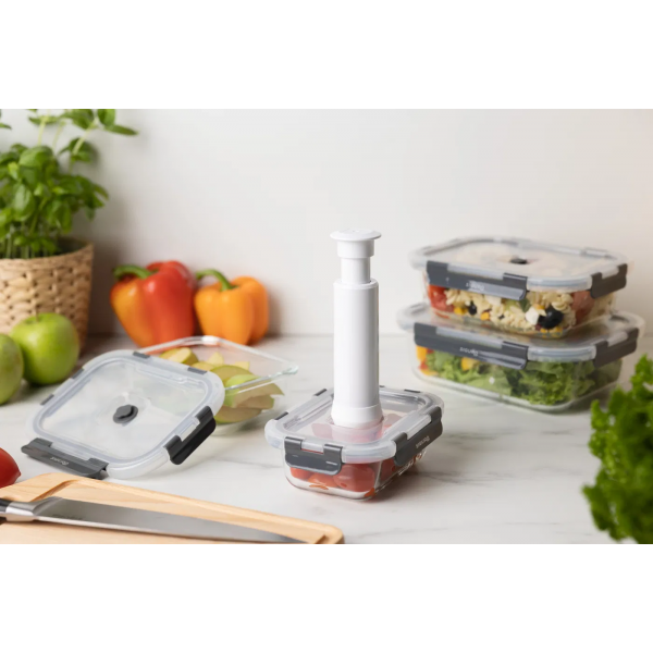 Súprava sklenených vákuovacích dóz na uchovanie potravín dlhšie čerstvých. Vákuovacia pumpa v balení. 4 dózy s viečkami v 4 veľkostiach. Tepelne odolné sklo vhodné aj na zapekanie či mrazenie.