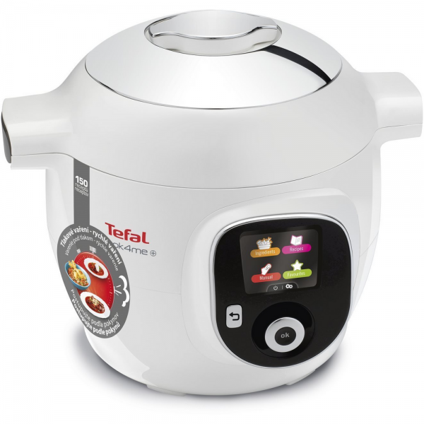 Tefal CY851130 Cook4Me multifunkčný hrniec 6 l, príkon 1 600 W, tlakové varenie, varenie v pare, pečenie aj smaženie, automatické programy, displej, časovač, odložený štart, udržiavanie teploty, vyberateľná nádoba, termostat, naparovač v balení, biela farba.