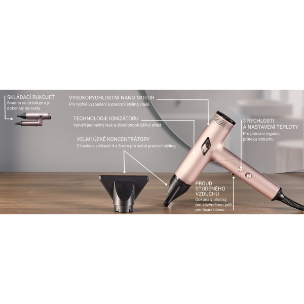 - Ionizačná technológia redukuje statickú elektrinu a zabezpečuje hladšiu štruktúru vlasov s prirodzeným leskom.