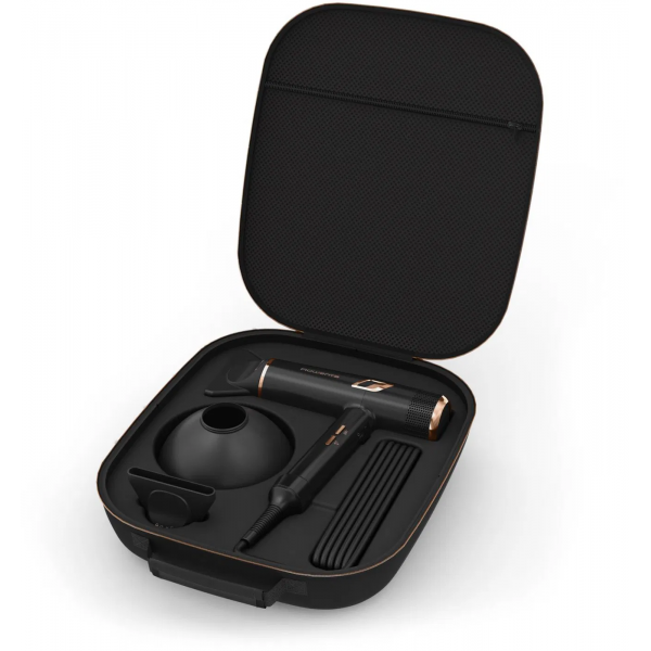 Vysoko výkonný fén vám behom pár minút vyčaruje profesionálny účes ako od kaderníka. Výkon 2000 W a bezkartáčový motor ženú vzduch tromi rýchlosťami pri troch teplotách. K dispozícii je aj tlačidlo studeného vzduchu. Fén navyše vlasy obohacuje o pozitívne a negatívne ióny, jednak, aby neboli presušené a netrpeli statickou elektrinou, jednak, aby boli žiarivo lesklé. Z fénu budete mať radosť už pri jeho vybalení z krabice. Jeho minimalistický dizajn a ľahké materiály potešia každé oko aj ruku. Čierne matné prevedenie s detailmi v lesklej medenej farbe si môžete hrdo zavesiť v kúpeľni a nemusíte ho schovávať do zásuvky. V balení nájdete tri nástavce: difuzér a dva koncentrátory, z ktorých jeden je len 5 mm úzky, takže vám pomôže vytvoriť precízny účes presne podľa vašich predstáv.