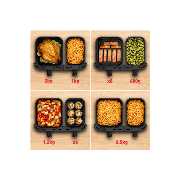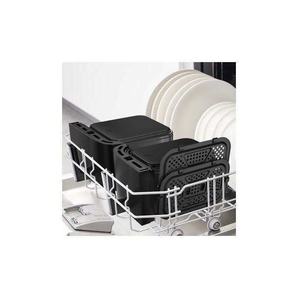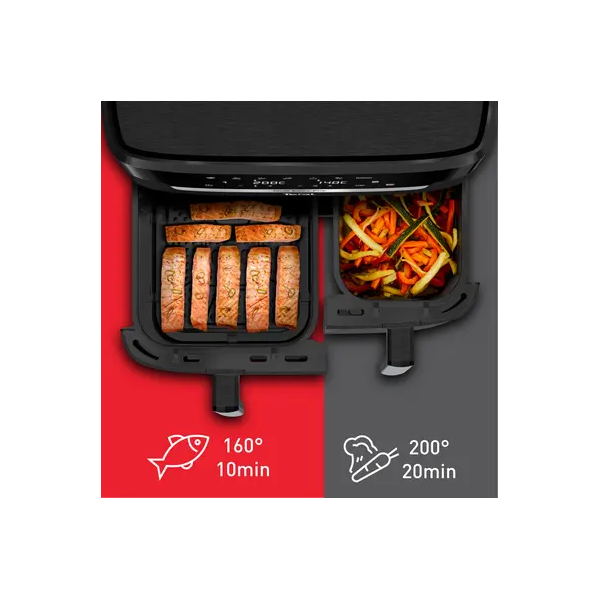 Chrumkať môže celá rodina. Fritéza s obrovským objemom 11 l pripraví dobroty a jedlá až pre 10 ľudí. Chrumkavé hranolky, vyprážaný syr, poriadna dávka rezňov alebo lahodné stripsy si môžete dopriať kedykoľvek, keď na ne dostanete chuť. S minimom oleja alebo úplne bez oleja si ich navyše užijete oveľa zdravšie, než keby ste ich vyprážali v klasickej fritéze či na panvici. Dve zásuvky s objemom 6,5 l a 4,5 l pojmú hlavné jedlo aj prílohu a pripravia ich v rovnakom čase. Do väčšej nádoby sa zmestí až 2 kg kura alebo 24" pizza, zatiaľ čo v menšej pripravíte až 1 kg hranoliek alebo 9 muffinov. Obe nádoby pracujú nezávisle od seba, takže im môžete nastaviť odlišné parametre a fritéza si sama synchronizuje čas dokončenia, aby bolo všetko hotové naraz. Vďaka 7 programom pripravíte množstvo rôznych receptov. Nájdete tu predvoľby na hranolky, kura, zeleninu, ryby, dezerty a sušenie. Manuálny režim vám umožní nastaviť teplotu aj čas podľa seba.