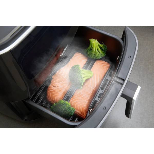 Teplovzdušná fritéza Tefal Easy Fry & Grill & Steam FW201815 prináša kombináciu troch spôsobov varenia v jednom zariadení – teplovzdušné fritovanie, grilovanie a varenie v pare. Vďaka unikátnej technológii Extra Crisp pripravíte jedlo chrumkavé zvonku a šťavnaté zvnútra, pričom zachováte maximum živín aj prirodzenej chuti. Horúci vzduch cirkuluje po celej nádobe a umožňuje prípravu pokrmov s až o 99 % menej tuku v porovnaní s klasickým vyprážaním. Funkcia Steam zas využíva silu pary s teplotou 100 °C, ktorá uchová vitamíny, textúru aj prirodzenú farbu surovín. V aplikácii od Tefalu nájdete viac než 30 digitálnych receptov zostavených šéfkuchárom na každodennú inšpiráciu.