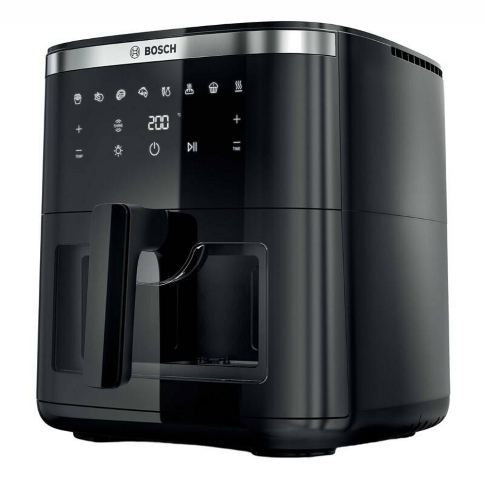Teplovzdušná fritéza Bosch Serie 6 MAF671B0, príkon 1800 W, objem 7,2 l až pre 5 porcií, dotykový displej, regulácia 40–200 °C, 8 programov, priehľadné okienko s osvetlením, Shake alarm, nepriľnavý kôš, bez nutnosti predhrievania, jednoduchá údržba a zdravé smaženie s minimom oleja.