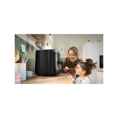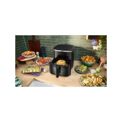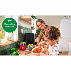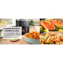 - Dotykový displej umožňuje jednoduché nastavenie teploty v rozsahu 40–200 °C a výber z 8 prednastavených programov. Vďaka tomu pripravíte hranolky, mäso, zeleninu aj pečivo bez zložitého nastavovania.