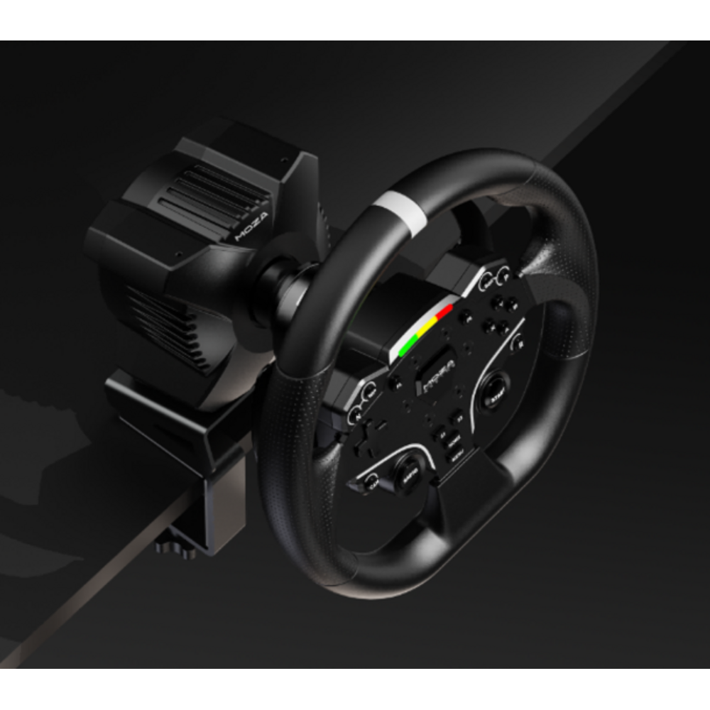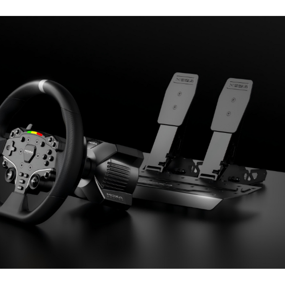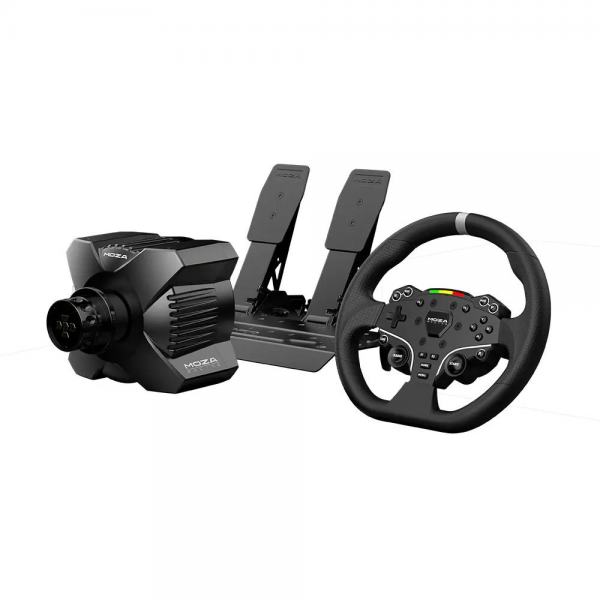 - Set MOZA Racing R3 obsahuje volant, pedále a základňu, takže poskytuje kompletné riešenie pre závodné simulátory.