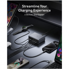 - Nabíjačka ponúka 4× USB-C a 2× USB-A výstupy pre súčasné napájanie viacerých zariadení.
