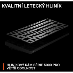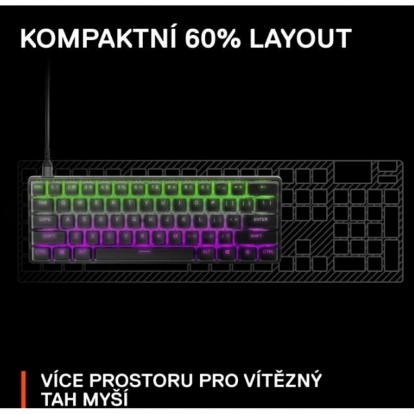 - Na obrázku je klávesnica v kompaktnom 60% prevedení so 61 klávesmi. Vďaka menším rozmerom poskytuje viac priestoru na pohyb myši pri hraní.