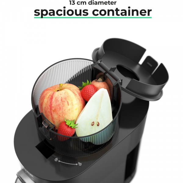 - Plniaci otvor s veľkosťou 130 mm umožňuje vkladať väčšie kusy surovín a v mnohých prípadoch aj celé plody bez zdĺhavého krájania. To zrýchľuje prípravu a spríjemňuje každodenné používanie odšťavovača.