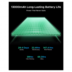 - Výdrž batérie až 13 000 mAh - výdrž 22,4 h pri prehliadaní webu, výdrž 147, výdrž 4 h hudobného prehrávania, 29,4 dní výdrž.