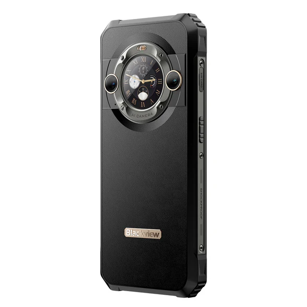 Blackview BL9000 predstavuje kombináciu luxusu a odolnosti. Je dostupný v celočiernej a čiernozlatej variante, s elegantným koženým texturovaným zadným krytom. Robustná konštrukcia však stále zaisťuje odolnosť v náročných podmienkach. Na zadnej strane je telefón vybavený jedinečným sekundárnym displejom. 1.32" kruhový displej poskytuje rýchly prístup k dôležitým informáciám, ako sú notifikácie, hovory, hodiny, ovládanie hudby, fotografovanie selfie zadným objektívom a ďalšie. Na displeji môžete kontrolovať a spravovať základné funkcie bez nutnosti aktivovať hlavný displej, čo šetrí energiu a predlžuje výdrž batérie. Na výber je tiež rad motívov pre personalizované prispôsobenie.