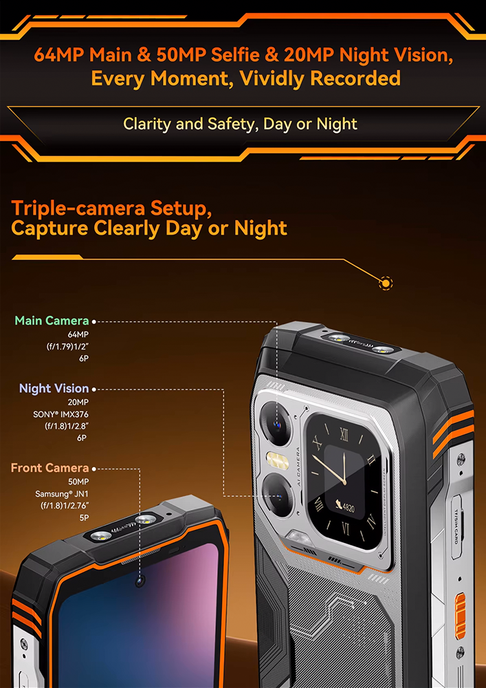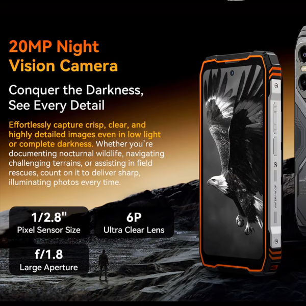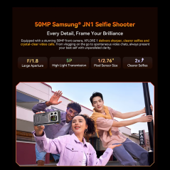 - Hlavný 50MP fotoaparát využíva pokročilé algoritmy na zachovanie detailov aj pri horšom svetle. Telefón navyše ponúka podvodný režim, ktorý umožňuje vytvárať fotografie aj videá vo vode bez obáv z poškodenia zariadenia. Moderná osemjadrová 5G platforma vyrobená 6nm technológiou ponúka rýchlu odozvu, svižný chod systému aj spoľahlivý výkon v náročnejších aplikáciách. Vďaka dynamickému rozšíreniu operačnej pamäte môže zariadenie využívať až 16 GB RAM, čo prispieva k plynulému multitaskingu aj behu navigačných a trackovacích aplikácií na pozadí.