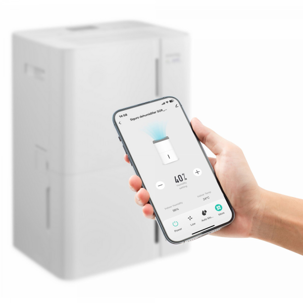 Siguro DH-M100W Air Control je výkonný kondenzačný odvlhčovač navrhnutý pre moderné domácnosti. Pomáha odstrániť nadmernú vlhkosť, zlepšuje kvalitu vzduchu a zabraňuje vzniku plesní. Vďaka kapacite až 30 litrov za deň dokáže efektívne odvlhčiť miestnosti do 35 m². Ponúka inteligentné Wi-Fi ovládanie, ionizáciu vzduchu aj uhlíkový filter. Tichá prevádzka a praktické funkcie z neho robia ideálne zariadenie do bytov, kúpeľní aj pri sušení bielizne.