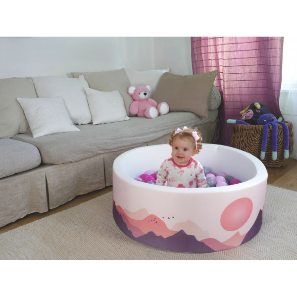 Máte doma malú princeznú, ktorej dokonale ladí vybavenie izbičky v odtieňoch ružovej? Náš suchý bazénik s motívom pohoria a kŕdľami vtákov v odtieňoch ružovej a fialovej je dokonalým doplnkom aj zábavou presne do takýchto izbičiek malých princezien. Elegantný, štýlový a jednoduchý dizajn s moderným nádychom. Bazénik je vhodný pre deti od 1 roka.