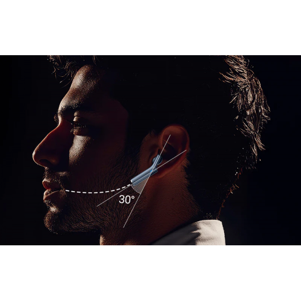 Okrem klasického mikrofónu sú slúchadlá vybavené aj snímačom kostných vibrácií, ktorý zaisťuje presnejšie zachytenie vášho hlasu a presnejší preklad. Tento snímač oceníte najmä v hlučnom prostredí, ako sú kongresy a veľtrhy, kde zvyšuje presnosť zachytenia hlasu až na 90 % pri úrovni hluku 100 dB. Okrem snímača sú slúchadlá vybavené aj funkciou BoostClean, ktorá izoluje šum, a 4-kanálovým spracovaním TurboFast, ktoré filtruje ruchy v reálnom čase. Vyššej zrozumiteľnosti napomáha aj optimalizované 30° zalomenie, ktoré prirodzene smeruje mikrofón k ústam, takže sníma hlas čisto a presne. Správne natočenie zlepšuje zachytenie reči a zrozumiteľnosť v hovoroch, videokonferenciách aj záznamoch, pretože mikrofón sníma viac vášho hlasu a menej okolitého hluku.