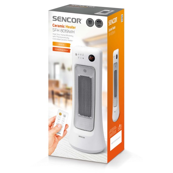 Sencor SFH 8019WH je keramické ohrievače s PTC článkami, ktoré sa rýchlo nahrejú, automaticky prispôsobujú výkon okolitej teplote a hrejú efektívne bez vysušovania vzduchu. Ponúka dva výkonnostné stupne – 1 200 a 2 000 W, nastaviteľný termostat v rozsahu 5–35 °C a voliteľnú osciláciu 80° pre rovnomerné rozptýlenie tepla po miestnosti. Tichá prevádzka okolo 50 dB je doplnená kvalitným vzduchovým filtrom, senzorom pohybu (Body senzor) s detekciou osoby do 1,8 m a úsporným režimom Eco pre nižšiu spotrebu. Ovládanie je pohodlné dotykové aj pomocou diaľkového ovládača a vďaka rukoväti a nízkej hmotnosti sa prístroj ľahko prenáša medzi miestnosťami. Ideálna voľba do bytu, kancelárie aj na chatu, keď potrebujete rýchlo a komfortne zohriať seba aj okolie.