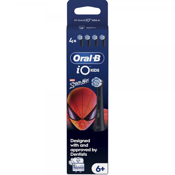 Balenie 4 ks náhradných hlavíc pre elektrické zubné kefky Oral-B iO Kids 6+. S motívom – Marvel Spiderman. Vhodné pre deti od 6 rokov. Mäkké štetinky. Šetrné k kývajúcim sa zubom a citlivým ďasnám.