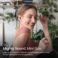 Ľahká a odolná konštrukcia – Každé slúchadlo váži len 6,5 g a je tvorené kombináciou pružnej nikl-titánovej zliatiny a mäkkého silikónového povrchu, ktorý zaisťuje isté, no nenápadné držanie. Slúchadlá prešli viac ako 5 000 testami ohybnosti a bez problémov zvládajú každodenné používanie. Ergonomické uchytenie sa prispôsobí tvaru ucha a zostáva pohodlné aj po mnohých hodinách nosenia. Otvorený dizajn neupcháva zvukovod, takže počúvanie zostáva prirodzené počas celého pracovného dňa. Sú vhodné aj pri nosení okuliarov, čiapok, klobúkov a pod.