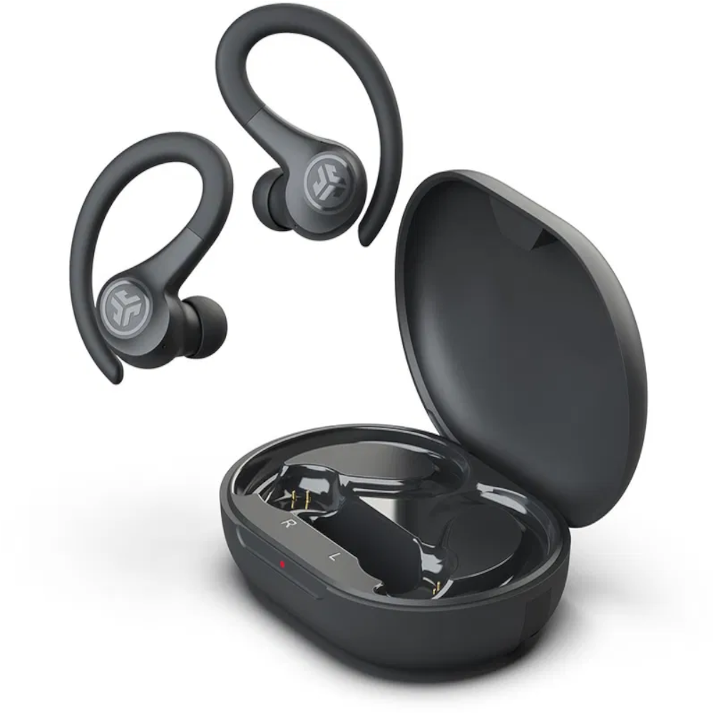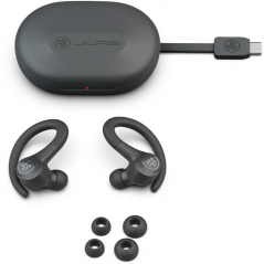 JLab Go Sport+ (Graphite) – bezdrôtové športové True Wireless slúchadlá za uši s mikrofónom. Bluetooth 5.1, AAC/SBC, ovládanie na slúchadlách, IPX5, výdrž až 32 h, nabíjanie USB-C.