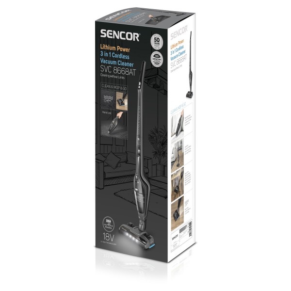 Tyčový vysávač SVC 8668AT je praktickým pomocníkom na upratovanie vašej domácnosti. Určite ho oceníte, ak sa staráte o menšie podlahové plochy, s ktorými si hravo poradí. 45 minút bežnej prevádzky vystačí na celé upratovanie a na silne znečistené miesta môžete prepnúť na intenzívne čistenie, ktoré zvýši výkon vysávača, ale mierne skráti dobu výdrže. Po upratovaní jednoducho vrátite vysávač do nabíjacej stanice a máte zase na chvíľu vystarané.